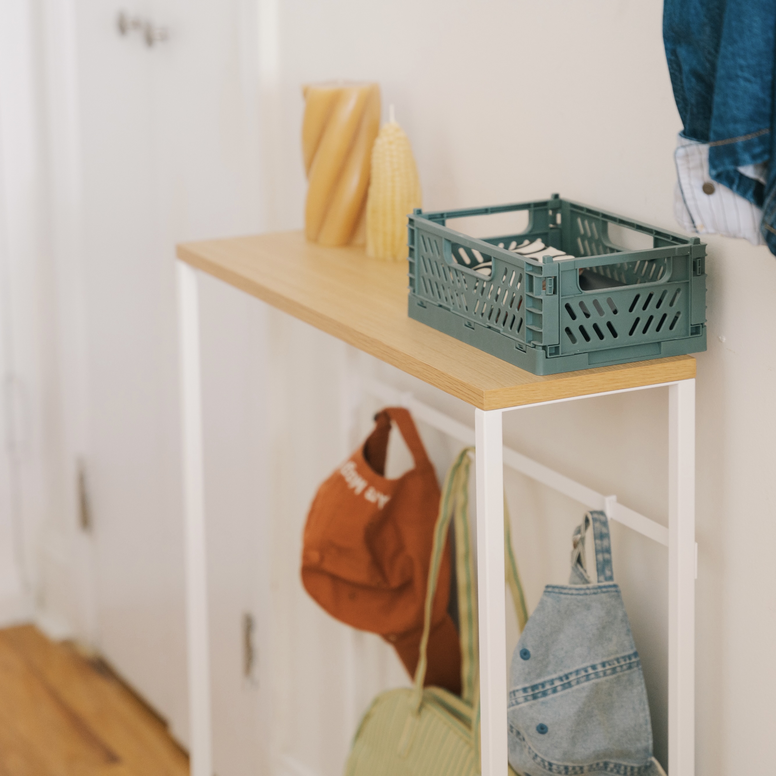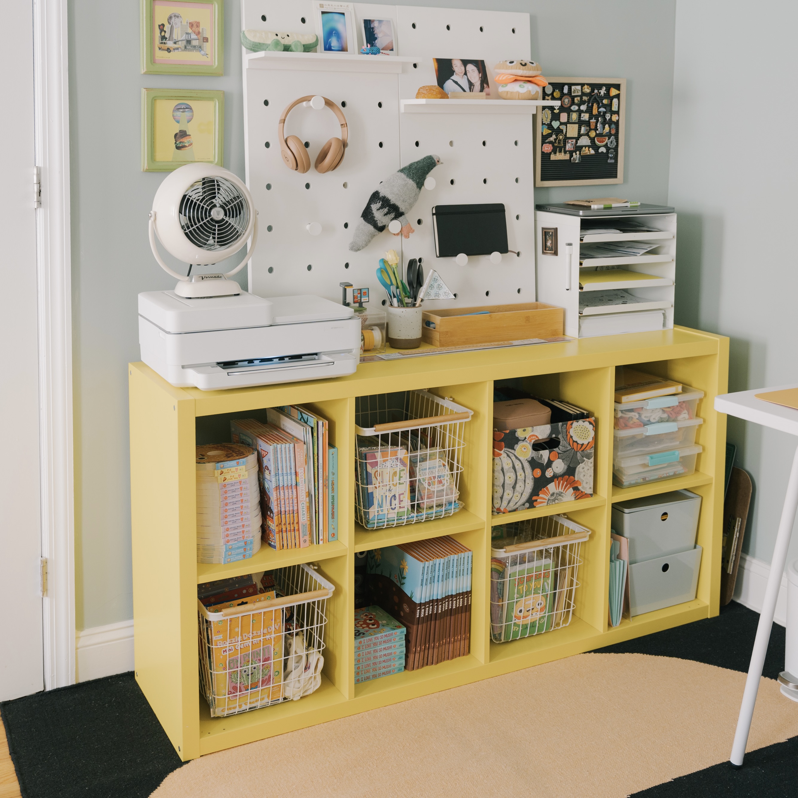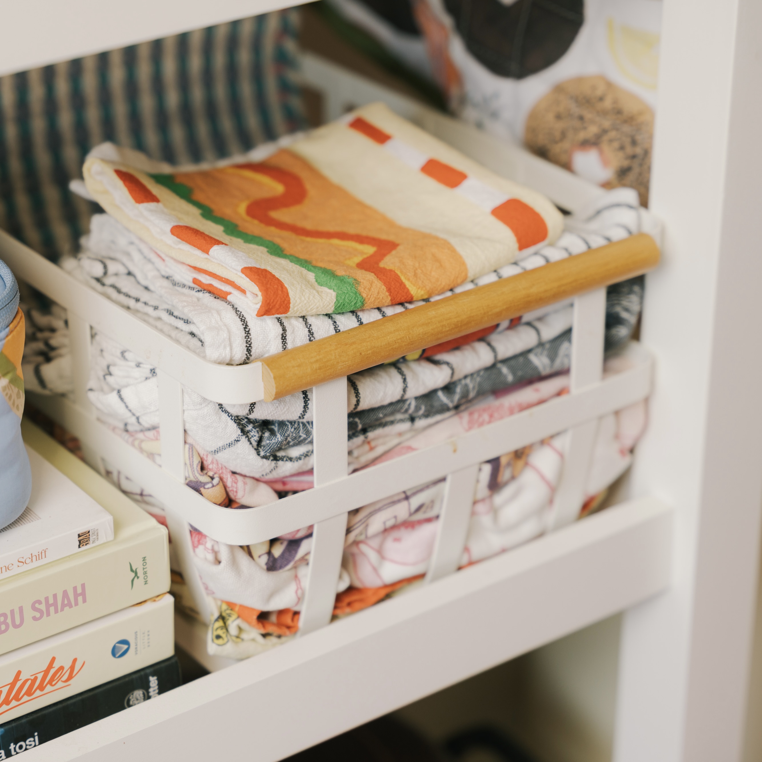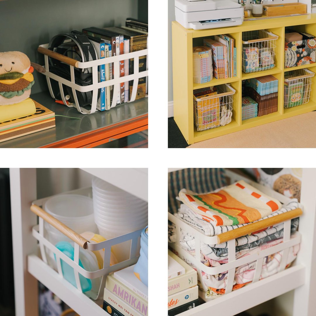 And then there are the Yamazaki Home baskets! She relies on a mix of the Tosca Storage Baskets and Tosca Wire Baskets throughout her apartment and studio. “The baskets are in pretty much every room of my apartment. They make it easy to organize anything while looking so clean and sleek.” From notebooks and stickers in her studio to tea towels in her kitchen and DVDs in her living room, Steph turns to the baskets to bring beauty and order to every corner.