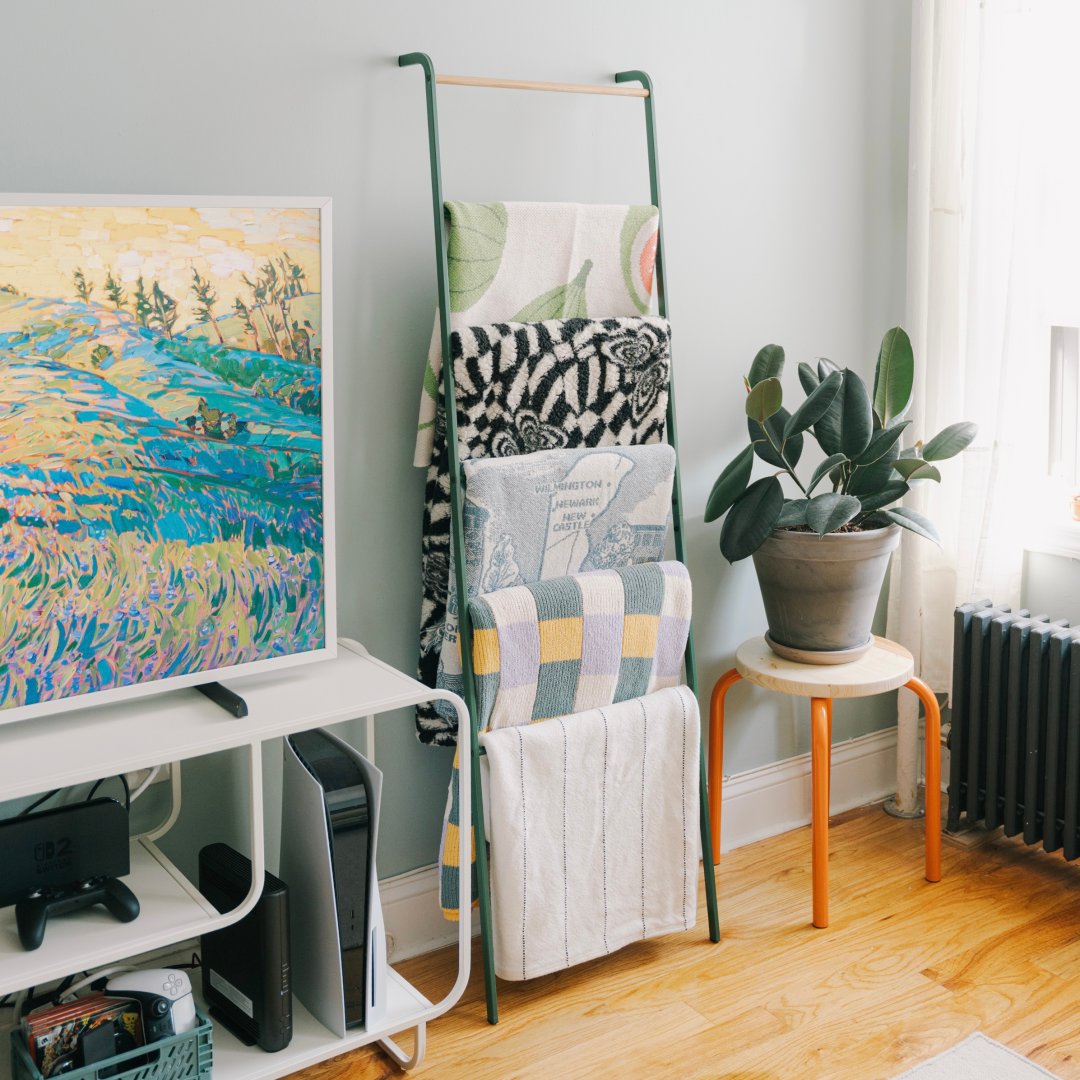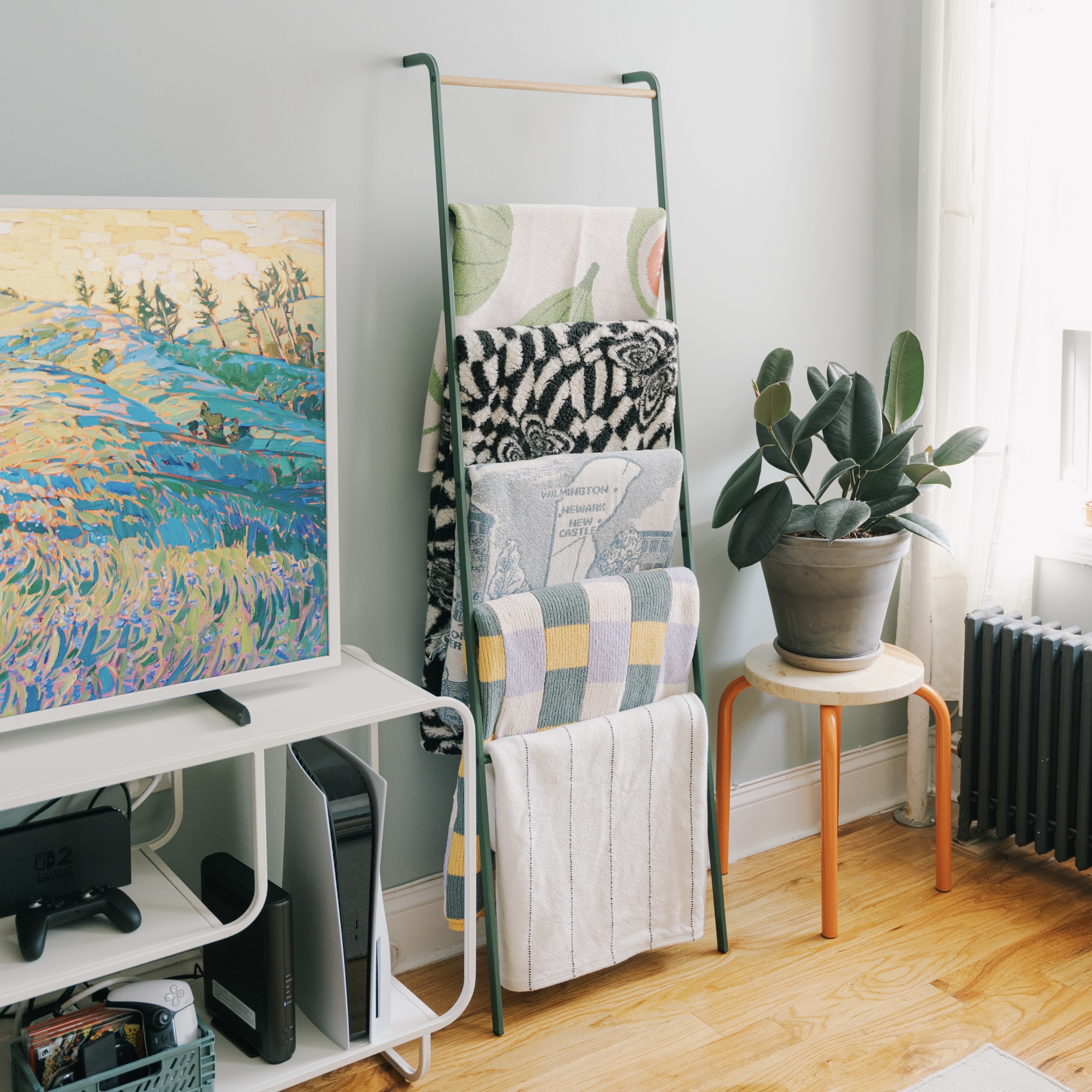 Her favorite piece? The Forest Green Leaning Ladder, which keeps her blankets on display while adding a touch of pattern and warmth to her living room. “I love how much coziness it adds to the space. If anyone is visiting, they can easily grab a blanket, which makes guests feel right at home.”