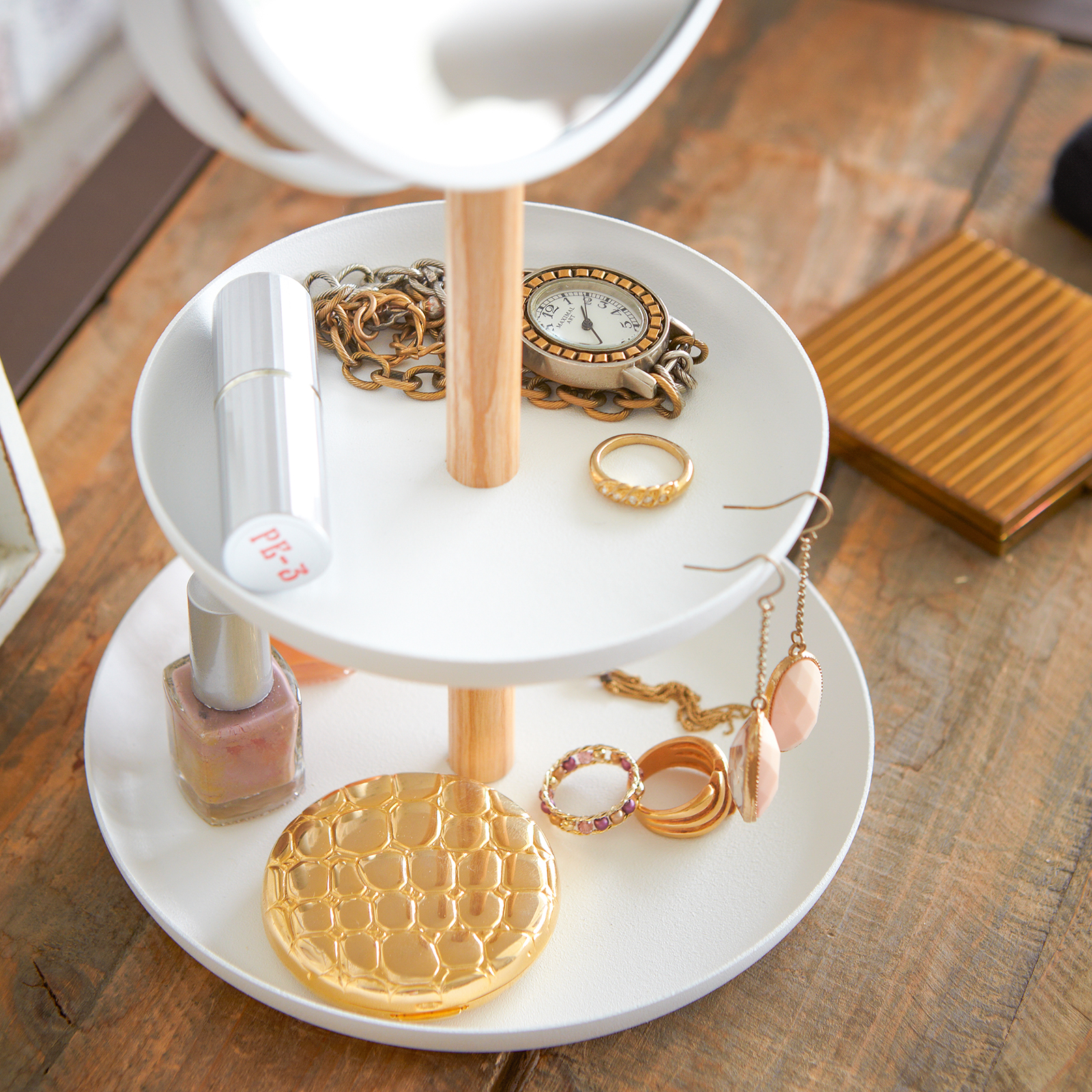 A storage mirror-cle for all your jewels. The two-tiered design allows for both chunky and delicate accessories to fit comfortably.