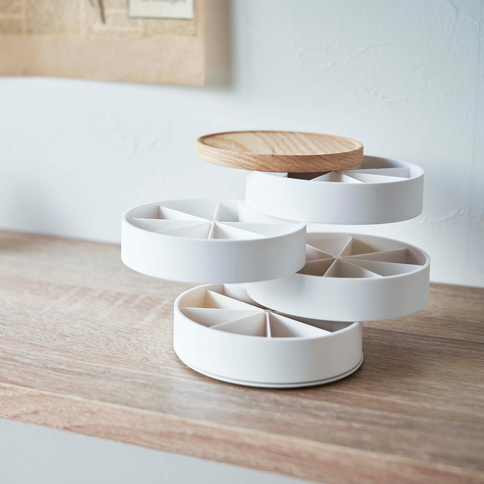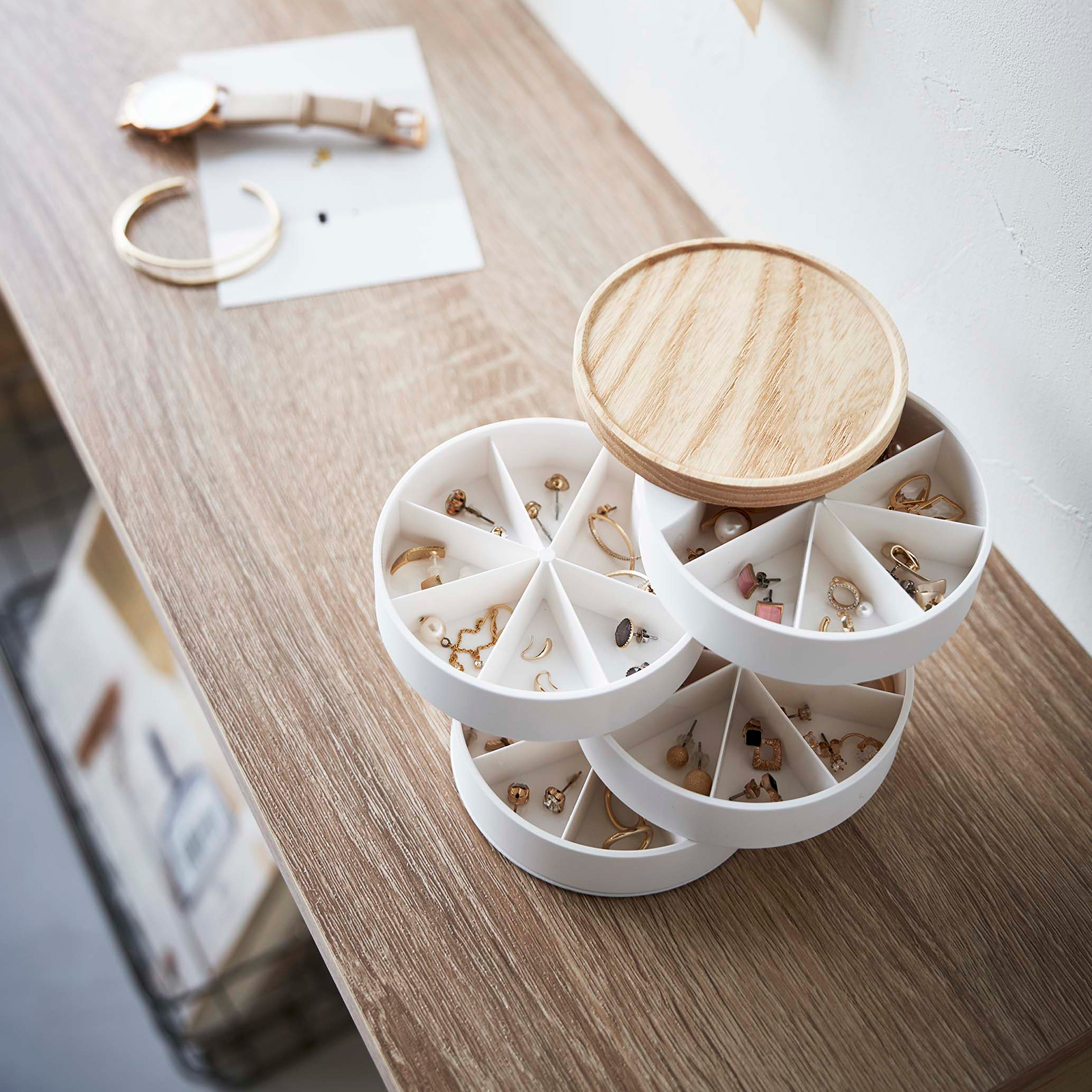 With a swivel and a slide, store all of your beloved accessories and trinkets in these chic organizers. Categorize your earrings, bracelets, and necklaces as you wish between the five tiers. Fan them out to let your baubles shimmer, sparkle, and shine, and close the wooden lid to protect from dust.