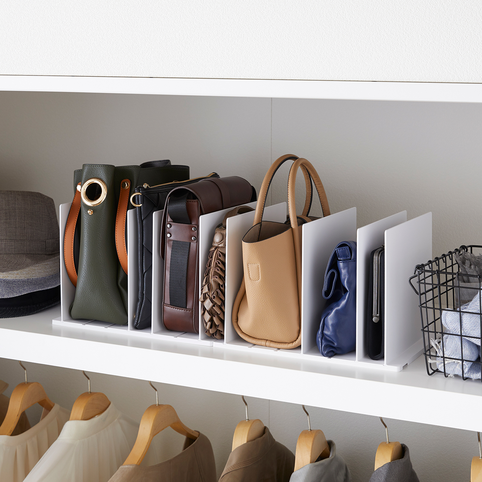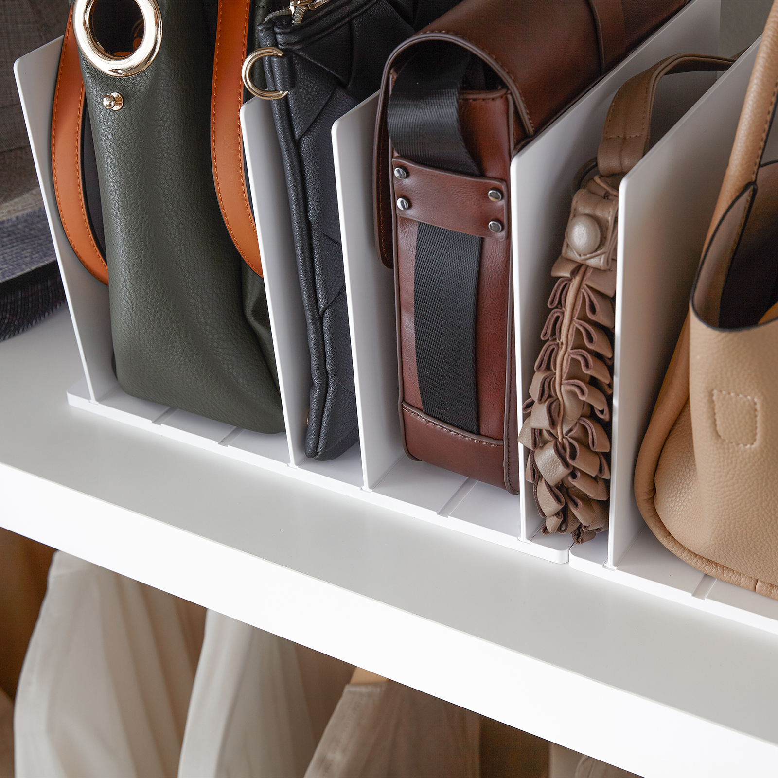 Lock the organizer into position according to the size of your bags to keep them all upright, perky, and pristine. Finally, a way to prevent your precious handbags from crushing one another in a giant heap.