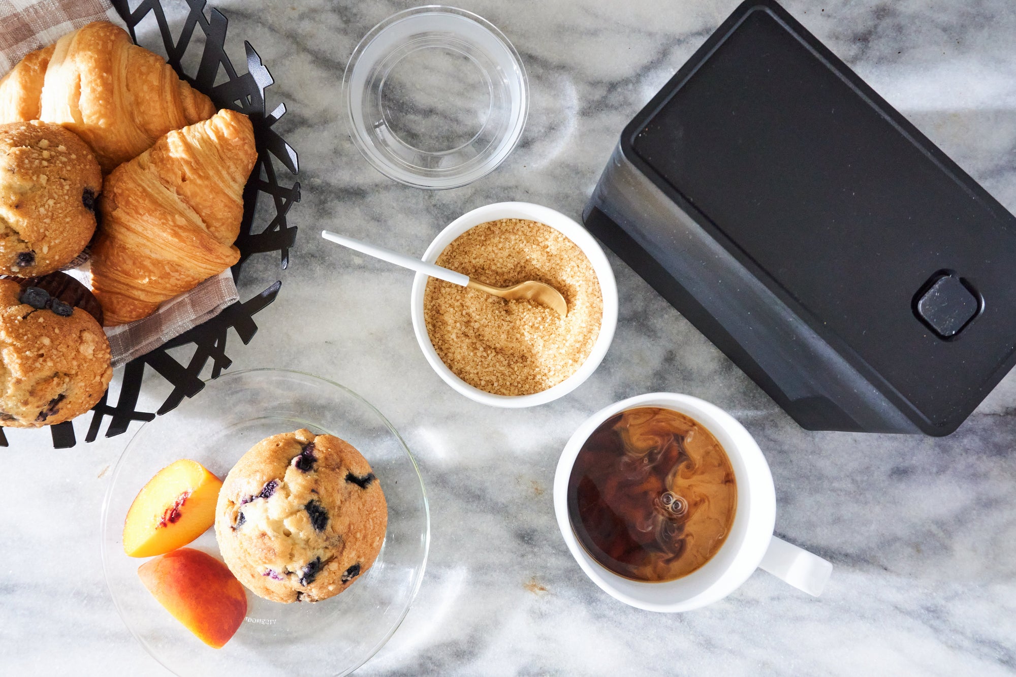 Mother's Day brunch spread. Granola recipe from Ashley Jenke. Shows spread of pastries, fruit, sugar, and coffee. Coffee grounds vacuum sealed container from Yamazaki Home.