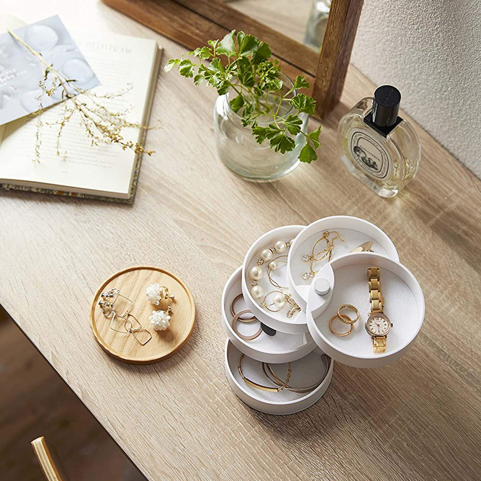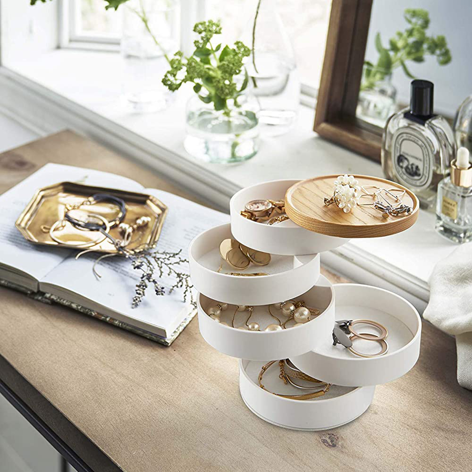 With a swivel and a slide, store all of your beloved accessories and trinkets in these chic organizers. Categorize your earrings, bracelets, and necklaces as you wish between the five tiers. Fan them out to let your baubles shimmer, sparkle, and shine, and close the wooden lid to protect from dust.