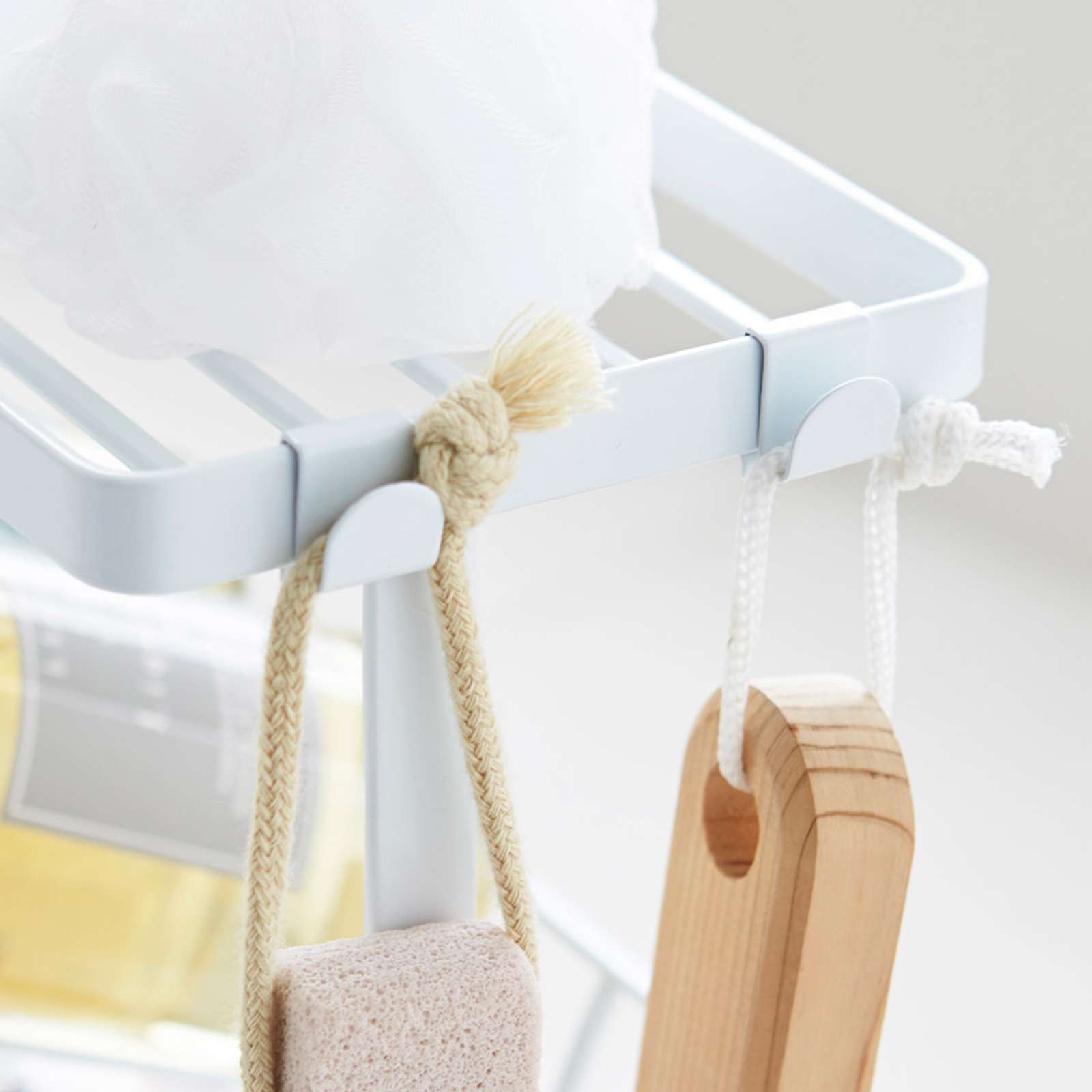 Skip the wall holder and opt for a free-standing caddy with plenty of room for shampoo bottles, soaps, and other shower essentials. If you have lotions galore spilling over your bathtub, try a freestanding caddy like this one to declutter your bath area, because you deserve as many shampoos, soaps, and rubber duckies as you want! Hooks to hold loofahs, brushes, and other scrubbing devices.