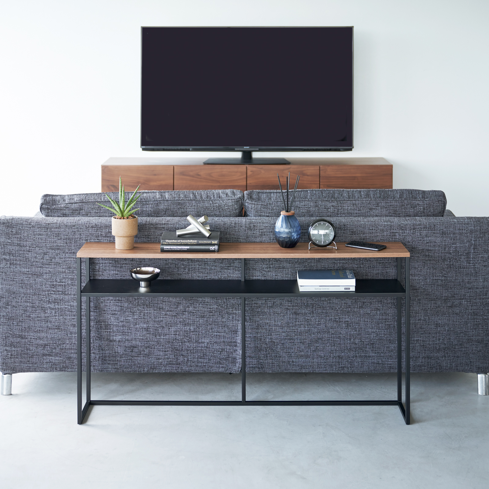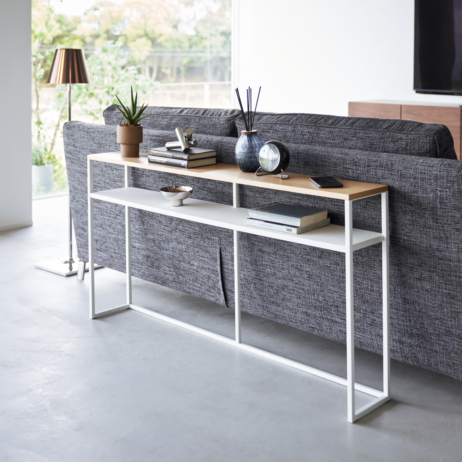This luxuriously long yet stealthily slim console table will add just the extra storage you need in your entryway or behind the couch. With a natural woodgrain top and minimalistic steel legs, this sleek design magically makes everything placed upon it look intentionally styled. Keep your living room or entryway essentials on the table, umbrellas and other hanging items on the hooks, and perhaps top it off with some decor items to accentuate your space.
