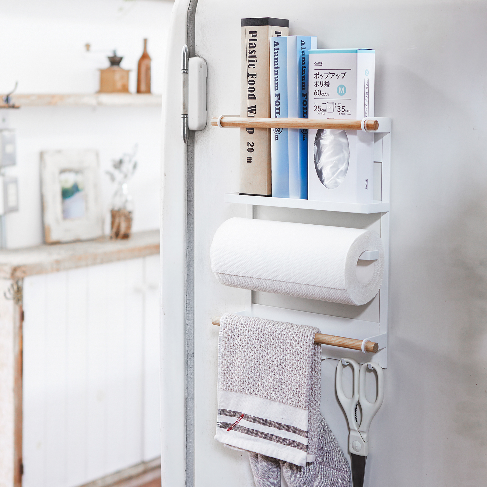 What has your fridge done for *you* today? Put that under-utilized surface to use with this multipurpose rack. Keep frequently used items off the counter, yet quickly accessible. Hand towel? Stat! Kitchen wrap, tin foil, olive oil? Voilá! The strong magnet of this kitchen attaches in seconds and *stays put—but the best part is seeing all that countertop space that suddenly opened up!
