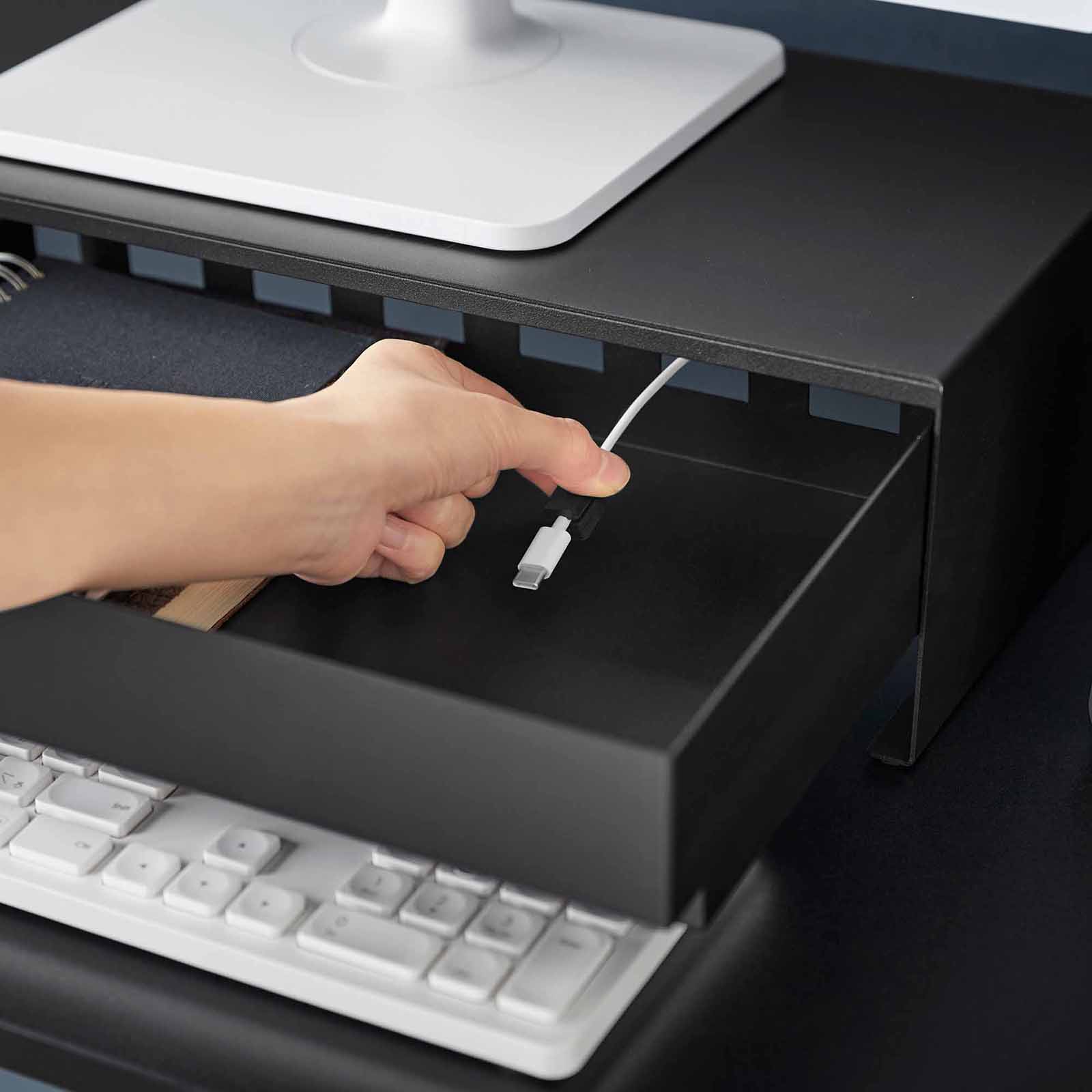Turn unused desk space into effortless organization. The Monitor Stand with Drawer keeps essentials tucked neatly out of sight and guides cords into place—bringing calm, order, and a little beauty to your everyday.