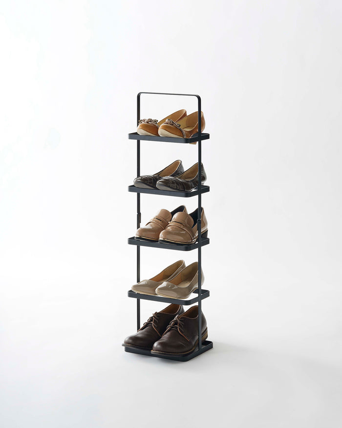 Perfect for maximizing vertical space, this taller shoe rack offers a minimalist design that showcases your shoes while keeping your space clutter-free. Its slim footprint allows it to fit neatly into any corner, closet, or entryway, yet it’s stylish enough to display prominently. The steel handle make it easy to move around, whether you’re rearranging furniture or trying on shoes as you prepare for your day. With five tiers of storage, this rack provides ample space while maintaining a sleek and modern look—ready to enhance your home wherever you place it.